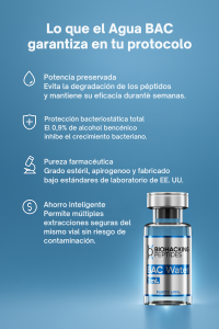 Es la base no negociable de cualquier protocolo peptídico serio y seguro. No comprar Agua BAC es como comprar un coche de lujo y llenarlo con gasolina de mala calidad. Simplemente no se hace.